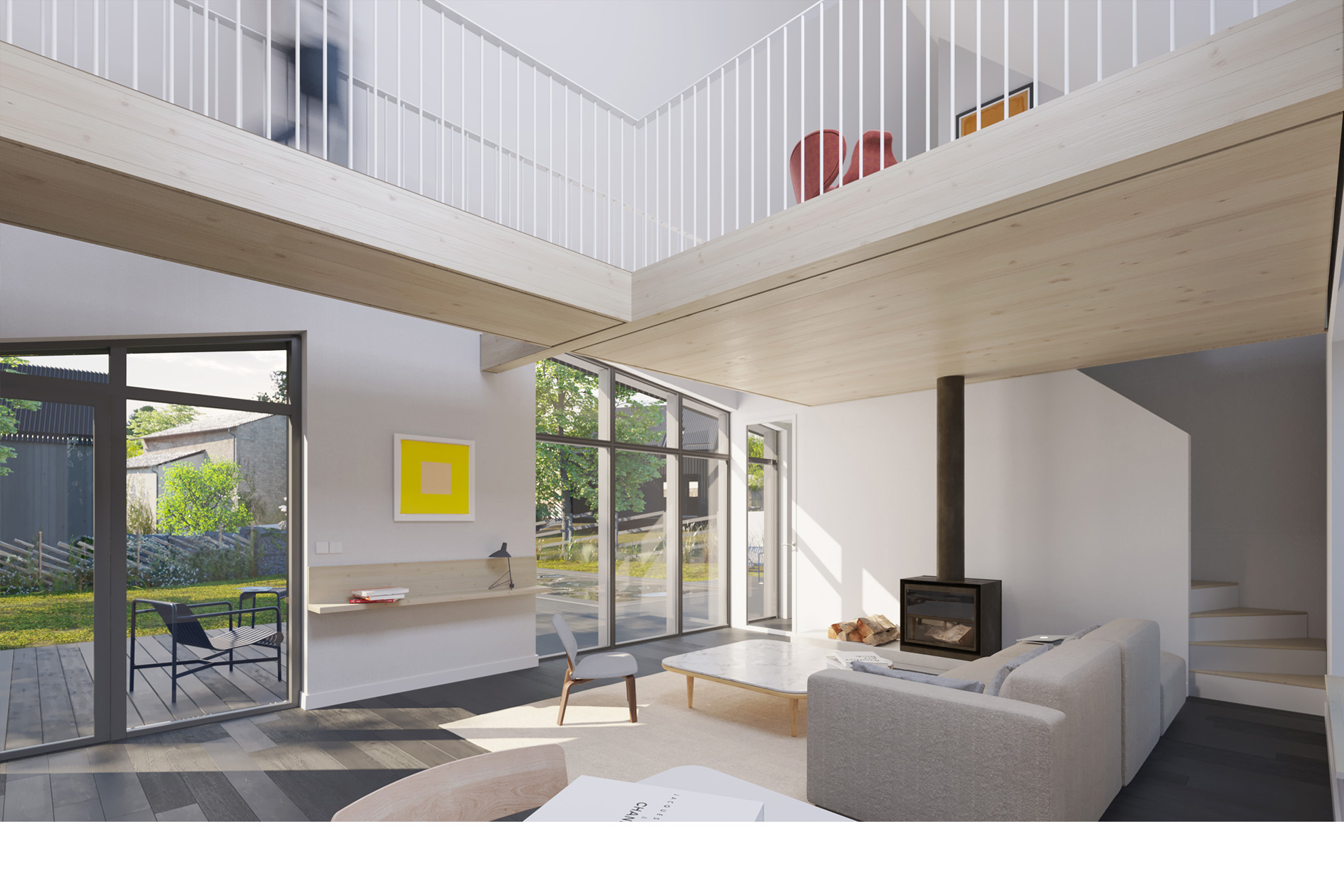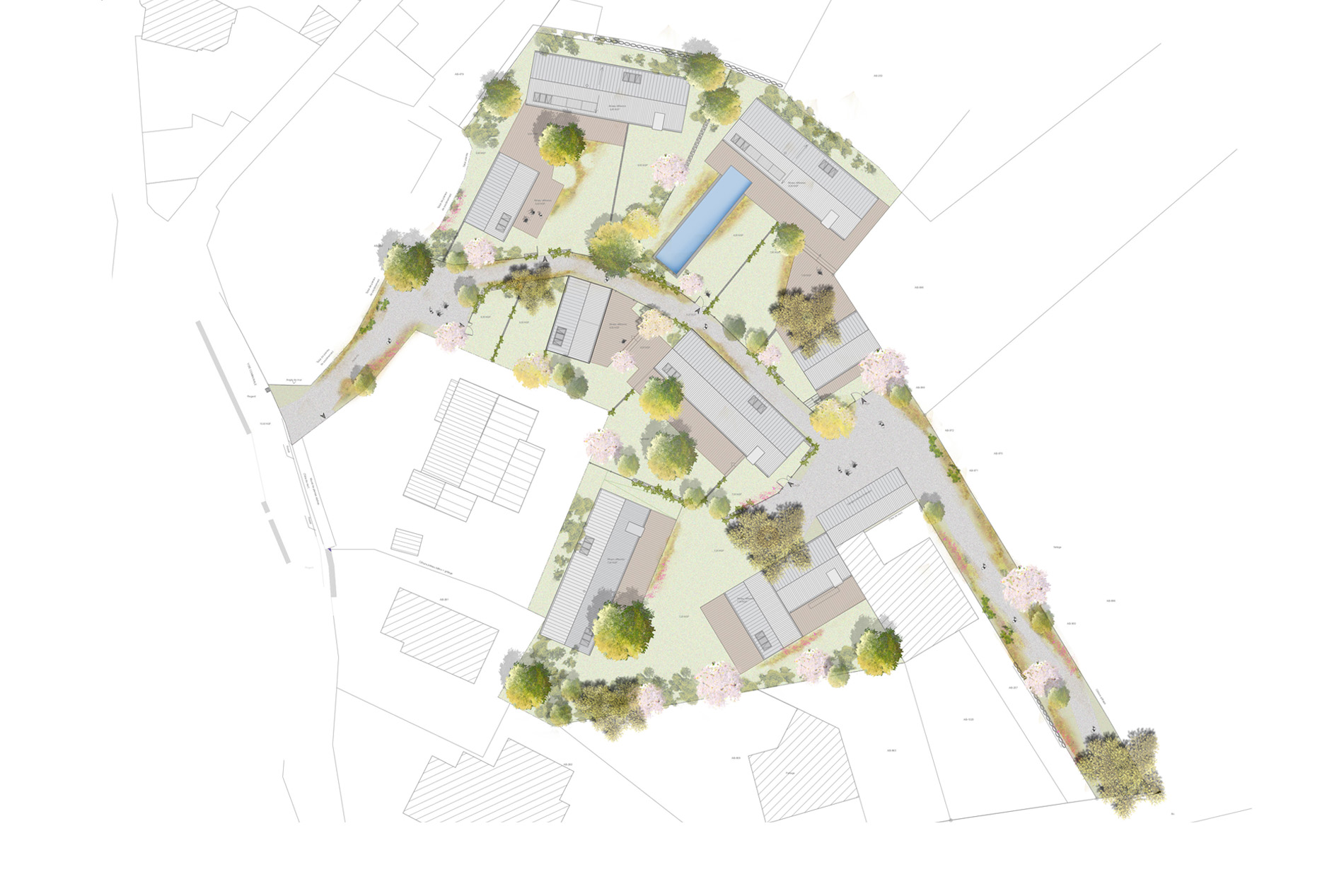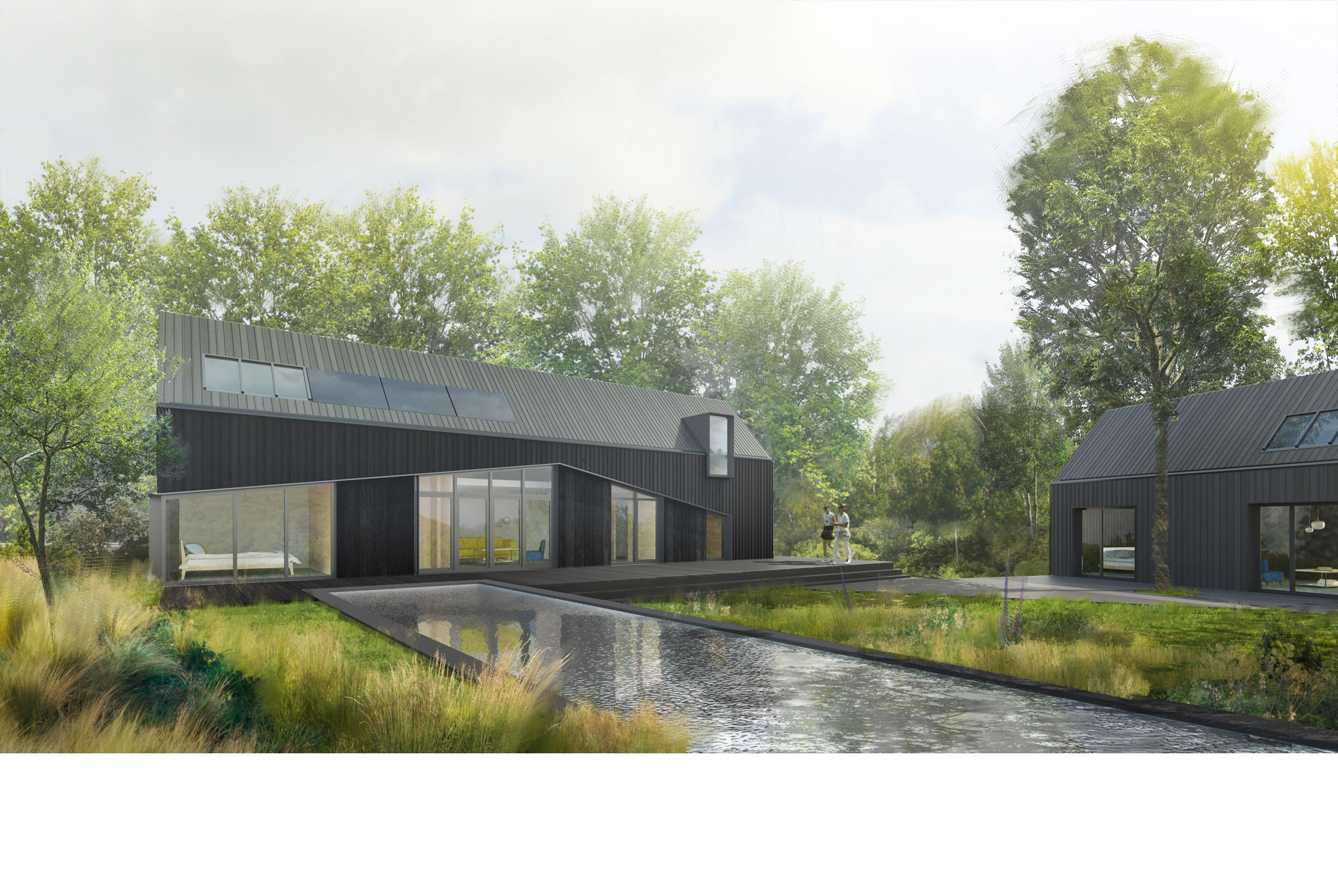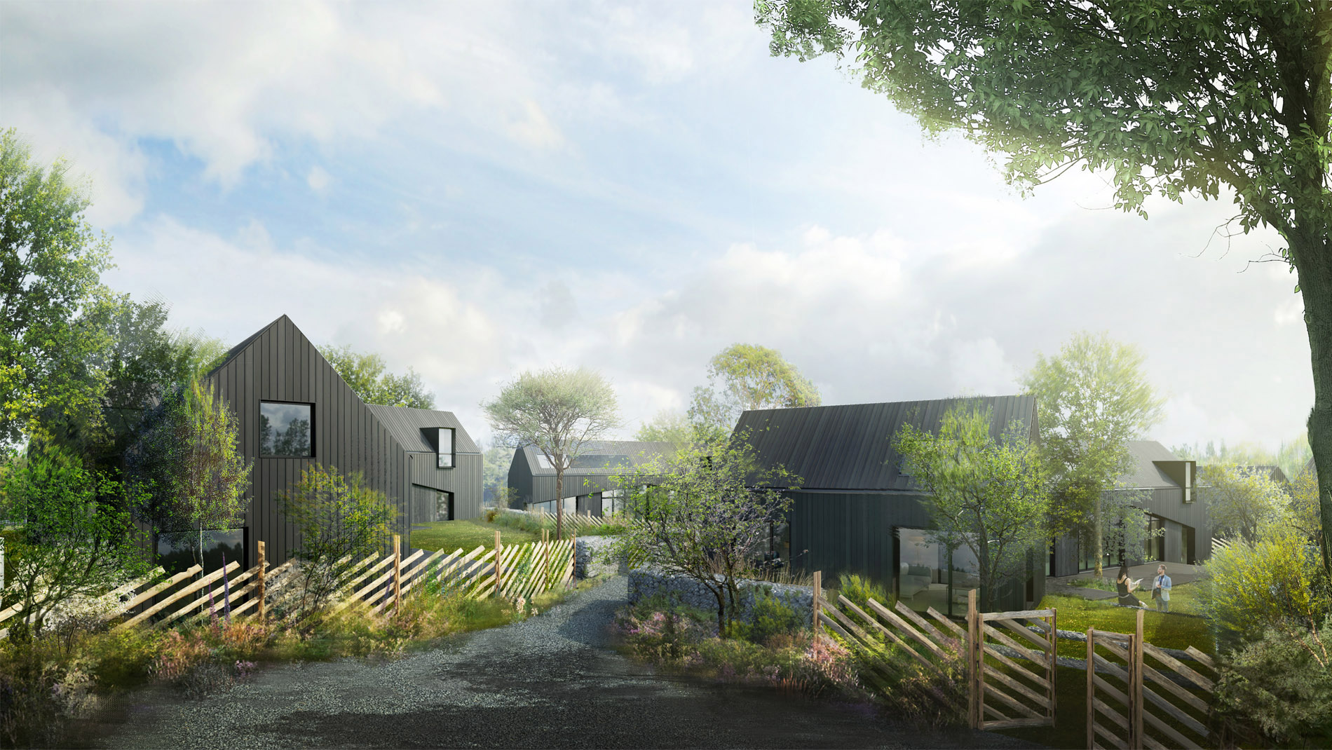 L’Île aux Moines, Golfe du Morbihan, construction d’un hameau de 5 villas sur une parcelle de coeur d’ilôt. Une venelle réservée aux piétons et vélos traverse le hameau. Bordée de gabions colonisés par la végétation et de palissades bois, elle laisse entrevoir les volumes épurés des habitations, toutes vêtues d’un bardage vertical en douglas teinté noir. Distribution simple. Volumétrie variée. Larges ouvertures sur le paysage de la parcelle. Constructions en ossature bois. Isolants bio-sourcés. Haute performance thermique.