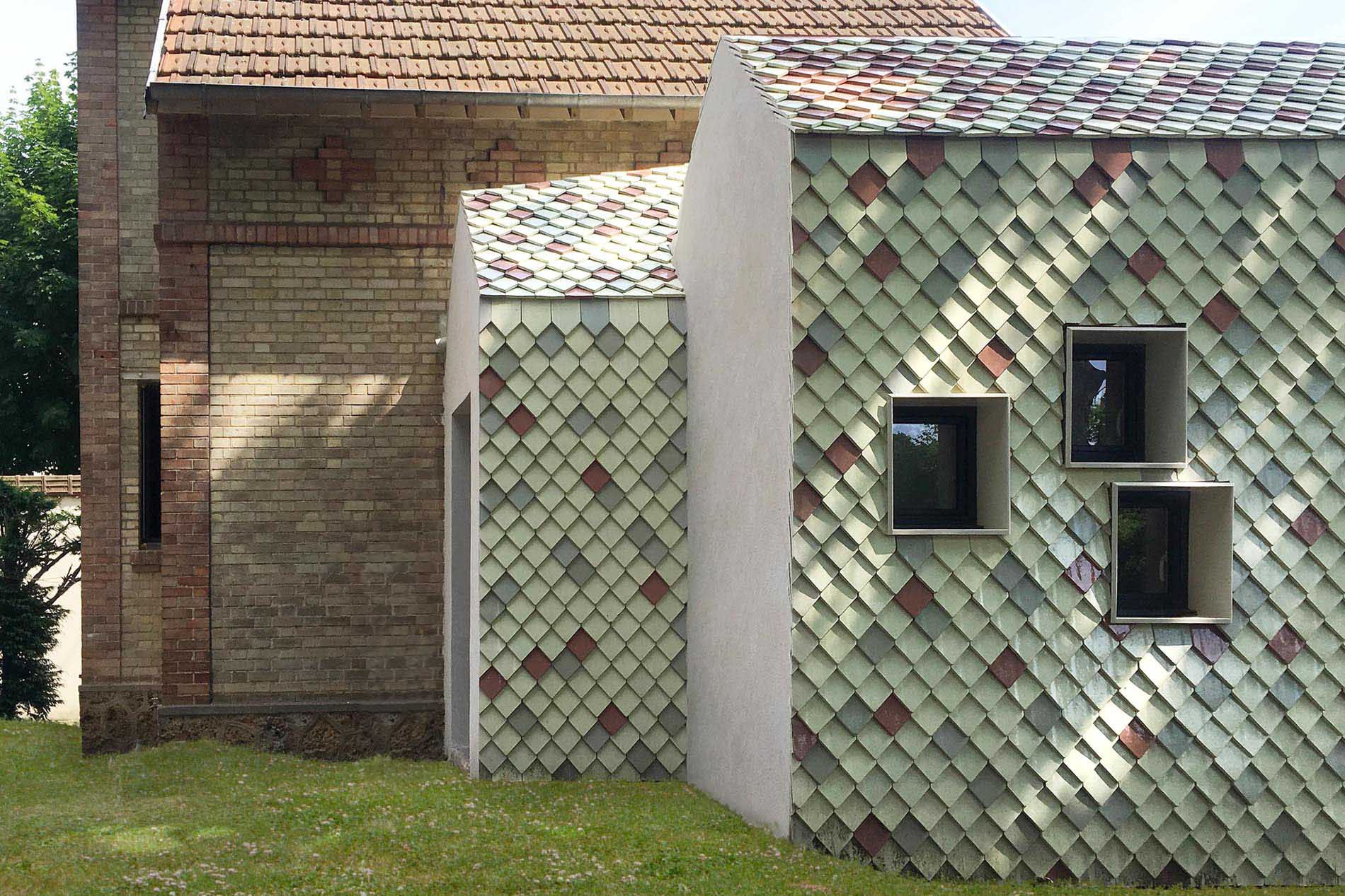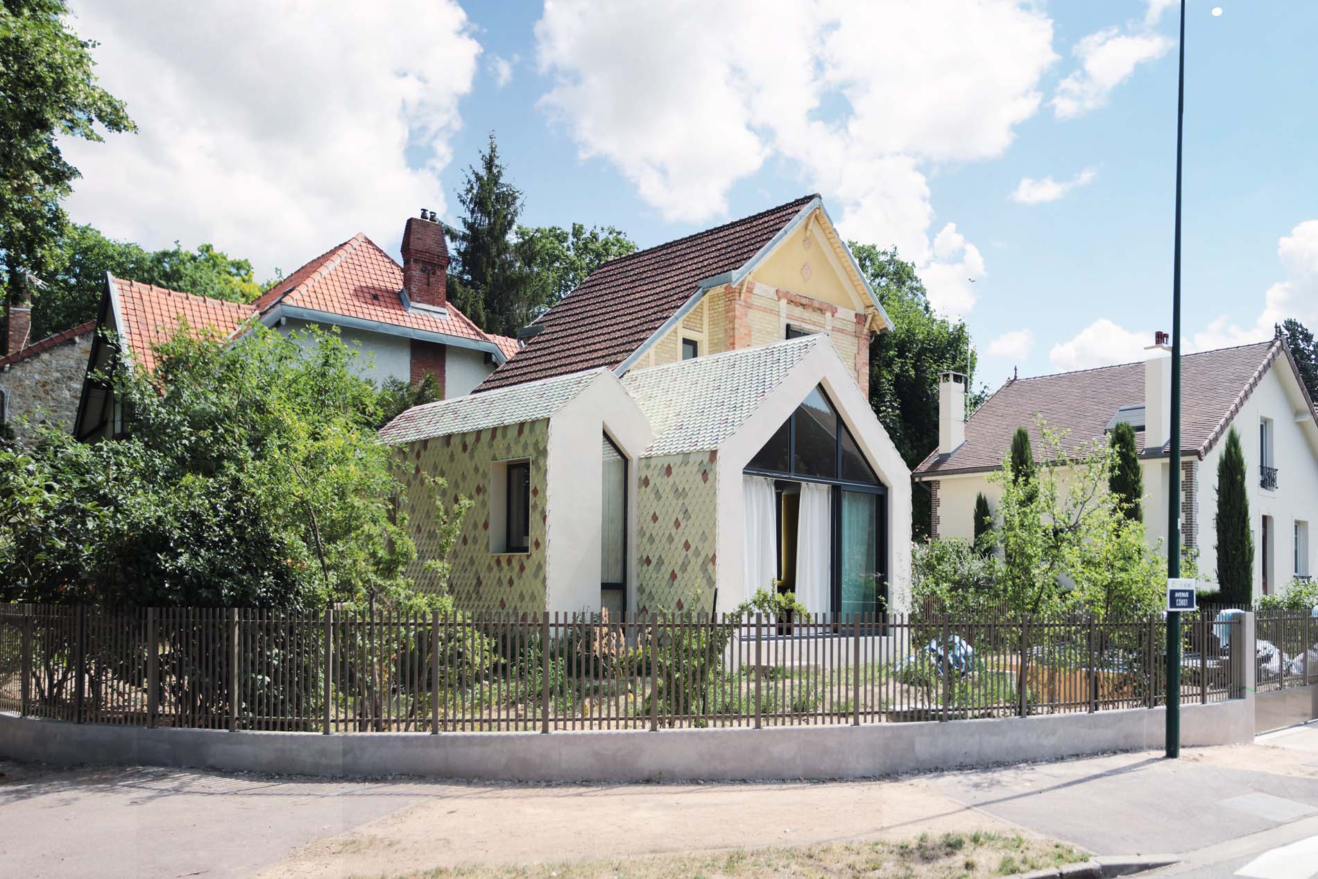 Extension et réhabilitation d’une maison située dans la cité-jardin du Vésinet. Le nouveau volume reprend l’écriture en pignon de l’existant avec des pentes identiques. Il est revêtu de tuiles émaillées fabriquées sur mesure en Bourgogne dont les teintes approchent celles des briques existantes.