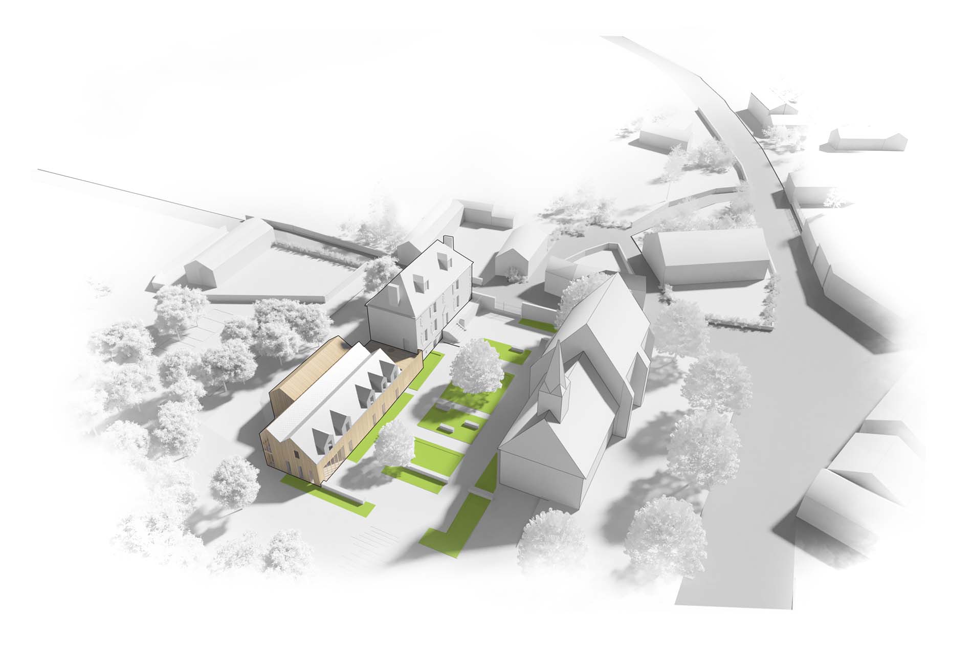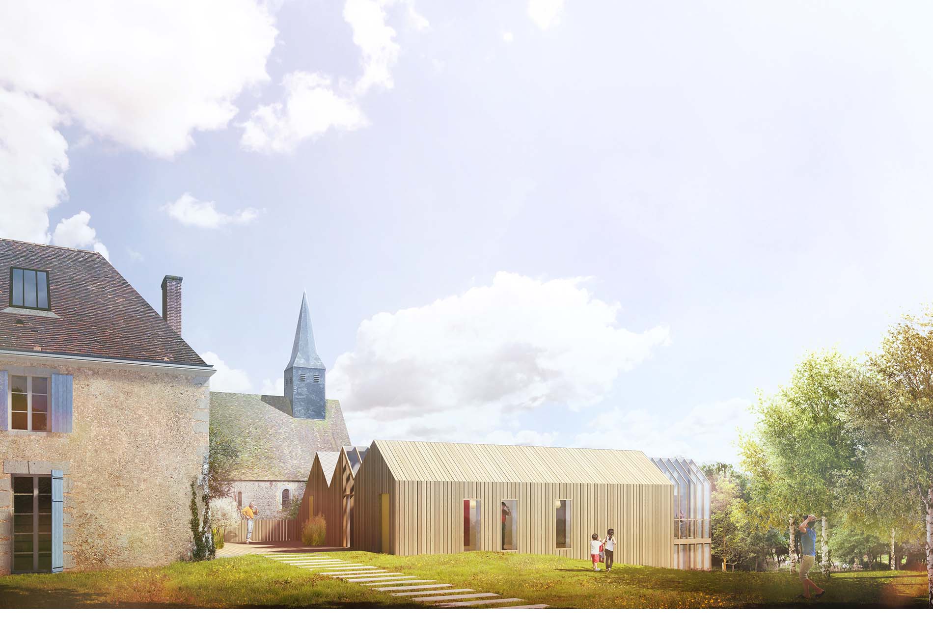 Reconversion du site du presbytère de la commune. Ce bâtiment du XVIIIème siècle et son annexe (XXème) sont réhabilités et étendus afin de créer un tiers lieu accompagné d’un restaurant et sa cuisine professionnelle. Les aménagements paysagers sont conçus pour permettre la cohabitation des 2 activités : le jardin sauvage et le jardin clos. L’annexe qui fait l’objet de l’extension réinterprète les typologies locales de manière contemporaine : la longère, les lucarnes de toit. La topographie du site est utilisée pour créer des jeux de niveaux inattendus : la toiture du volume des cuisines prolonge le niveau supérieur du jardin et devient un belvédère sur le jardin clos et l’église.